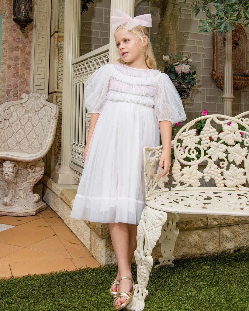 Radiant and refined, the Opaline Tulle Dress in Tiara sparkles with starlit majesty. Billowing layers of tulle and puffed sleeves shape a celestial silhouette, while the gem-strewn bodice glows beneath sheer tulle. Rows of jewels ascend to the neckline, mirroring constellations scattered across the heavens.