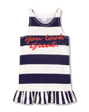 This relaxed-fit dress brings a fresh, summery feel with horizontal navy stripes. A bright red “You Look Great” print adds a cheerful note, while the frilled hem creates movement and playful contrast, finished with stripes running in the opposite direction. Made from 100% organic cotton, it feels soft, light, and comfortable on warm days.