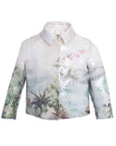 This elegant short jacket for girls features a beautiful, tropical-themed print of palm trees and flowers. Made in sequined hand-embroidered motif, this jacket is a true piece of art