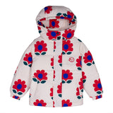 Warm and cosy duck down filled coat in playful april flowers print / fully lined / zip and popper fastening / welt pockets on front / drawcord at waist / shock cord and toggle on inside hem / square ecru logo badge on chest / this garment is shower proof