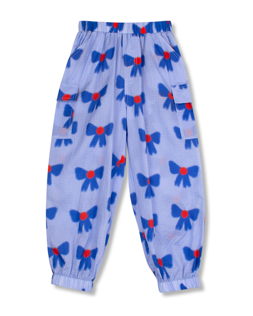 Lightweight, durable nylon keeps these pants cool and airy on warm summer days, with quick-drying properties that make them ideal for summer adventures. An elasticated waistband and cuffed legs provide a secure fit and full coverage, allowing easy, confident movement. Square side pockets alongside classic front pockets add a playful, practical detail for carrying small treasures. The soft blue base with all over bow print brings a light, summery feel to every outfit. Pair with the matching Aircon Loco Popover for a coordinated, sunny-day look.