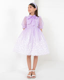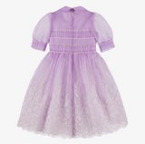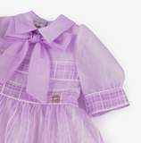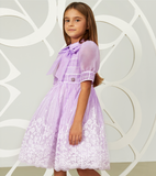 Ideal for a special occasion, a lilac purple and white organza dress for girls by luxury brand Elie Saab, with intricate striped and floral embroidery. It has a fixed bow on the neckline and full, puffed sheer sleeves with a tulle lining for extra volume. The skirt has tulle underskirts and a double lining with stiffened hems, giving a beautifully full silhouette. A gold metal logo charm is sewn on the waistband to complete the designer look.