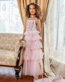 As if plucked from the pages of a fairy tale, the Dutchess Dreams Tutu Dress is her invitation to a world of magnificence and wonder. The long-layered skirt flows with grace, each layer cascading longer than the last, creating an ethereal silhouette that moves with the lightest of whispers. The bedazzled bodice, with sequin discs, radiant gems, and delicate smaller sequins, sparkles with every movement, while satin bows down the front add a charming finish.