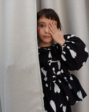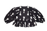This beautiful bow tie front blouse, designed with a gathered peplum waist detail, is in our signature black and features our Exclamation Hearts print.