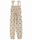 Powder-beige cotton gauze jumpsuit dotted with bouquets of flowers. The strapless top is embellished with a band of stretch bouillonné, whose gathers flare out to the elasticated waist. The pants, elasticated at the ankles, are lined in cotton voile to play off the fabric's delicacy and translucence. They have two raglan pockets so girls can hide their little treasures. A bow, purely decorative, highlights the waist.