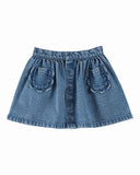 Mini skirt in blue denim cotton canvas. It is mounted on a waistband into which a buttoned elastic band slides to adjust to all sizes. The two gathered front panels close with fabric-covered buttons, and each features a lovely flower patch pocket for keeping hands warm or hiding little treasures.