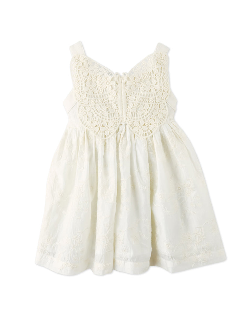 Adorned with a crochet butterfly and finished in breathable eyelet fabric, this offwhite Gabrielle dress captures the wonder of playtime and the freedom of graceful movement.