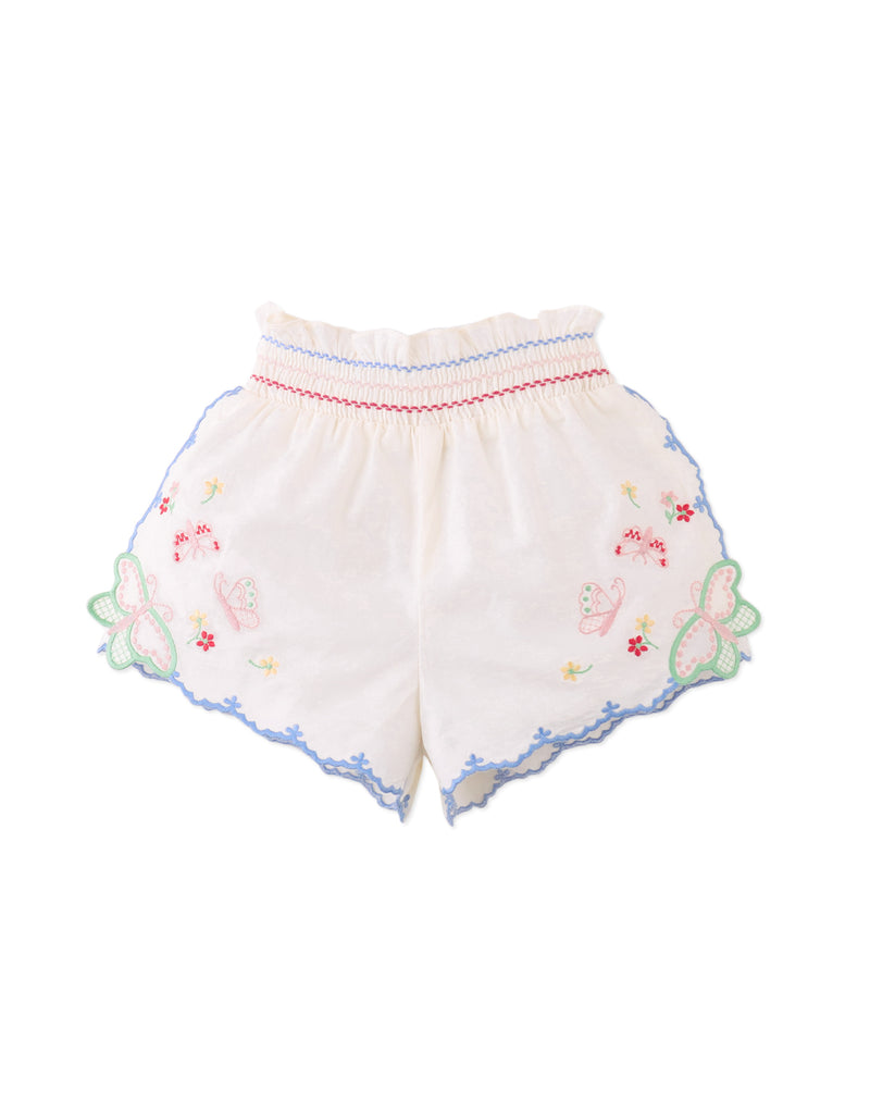 Let your child explore in style with these white poplin shorts, finished with a comfy smocked waistband, scalloped hems, and delicate butterfly accents.