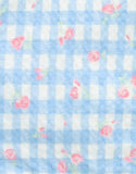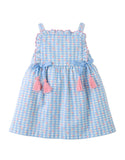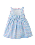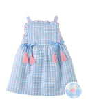Dress your little one in this blue cotton floral print on gingham dress with embroidered ruffles and bow details, a playful yet elegant piece that adds the perfect touch of floral whimsy to the loveliness of gingham.