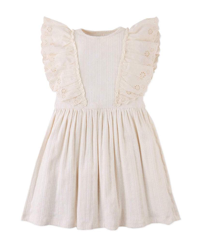 This multiribbed pointelle dress brings delicate detail to every moment, framed with airy eyelet ruffle sleeves and a softly gathered waist that twirls with ease.