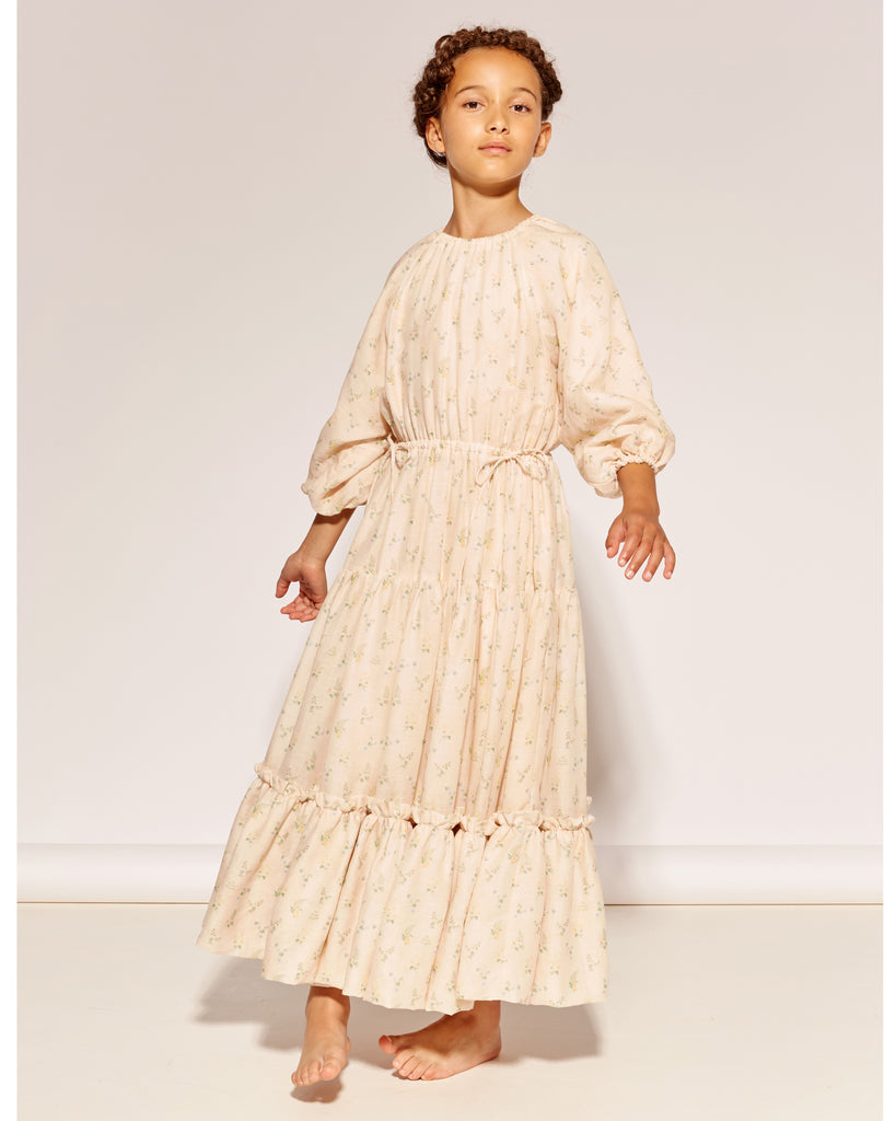 Soft ramie and cotton voluminous midi dress in our own developed ‘Clover & Fern’ print. Featuring a pie-crust gathered deep hem and an elastic channel to neck and waist, with pretty self tie’s. Concealed zip to centre back, fully lined.