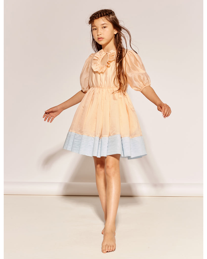 This dress, with its key-hole frill neck detail, is inspired by such a feeling. We playfully imagine this hole as a welcoming vortex to intentionally fall into (kind of Alice In Wonderland-esque), but more of an adventure for the mind. The stuff our girls partake in daily. And long may it last.