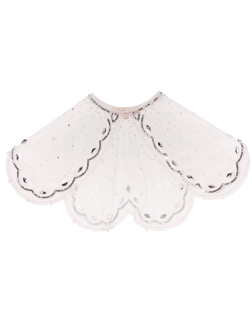 The Renaissance Cape is a timeless masterpiece in fine tulle, delicately draping atop shoulders to enhance any ensemble. This exquisite cape seamlessly accessorizes dresses with its ethereal grace. Hand-applied sequins and beads are thoughtfully arranged around the scalloped hemline, adding a touch of opulence and renaissance-inspired sophistication. by Tutu Du Monde
