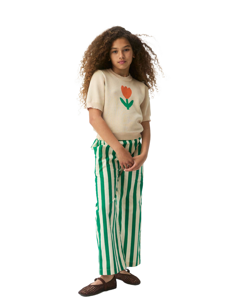 Girls' trousers made from 100% cotton. High-waisted elastic waistband. Wide straight leg.