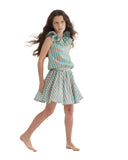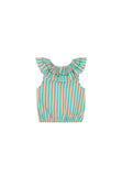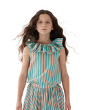 Cotton seersucker printed stripe top with fully gathered neck frill with contrast piping. Hem has an elastic channel. Button opening at back neck.