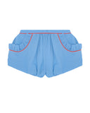 Cotton seersucker short with bubble hem cuff. Featuring pockets with deep frills and contrast piping.