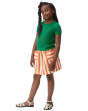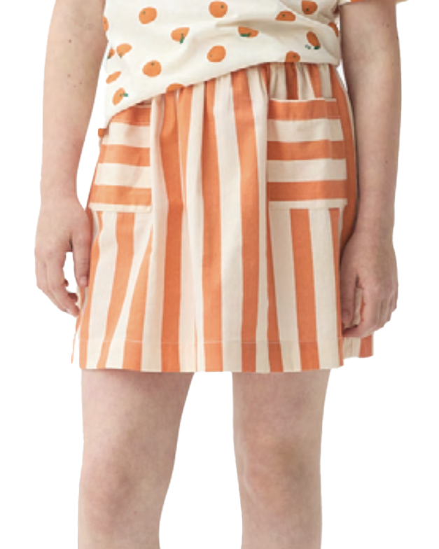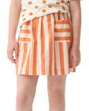 Girls' short skirt in 100% cotton fabric with stripes and pockets. High-waisted elastic waistband. Lined.