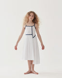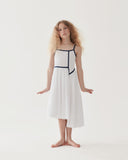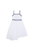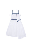Cotton voile Dobby Spot midi sundress featuring asymmetric skirts and contrast binding detailing to front and back. Fully lined. Button back opening to waist.