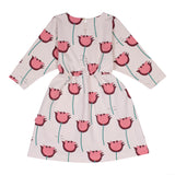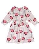 Blouson body with elasticated waist and full skirt / tapered sleeve / soft fleece jersey in playful all-over tulip print / flag logo label in side seam / button close at back neck / organic cotton