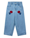 Made for movement and cooler weather, these comfy tapered light wash jeans are ready for whatever the day brings. Featuring embroidered roses adding a sweet, standout touch to any outfit. Thoughtfully designed to fit growing kids thanks to their hidden adjustable waistband features - A versatile favourite for playful days, dressed up or down!