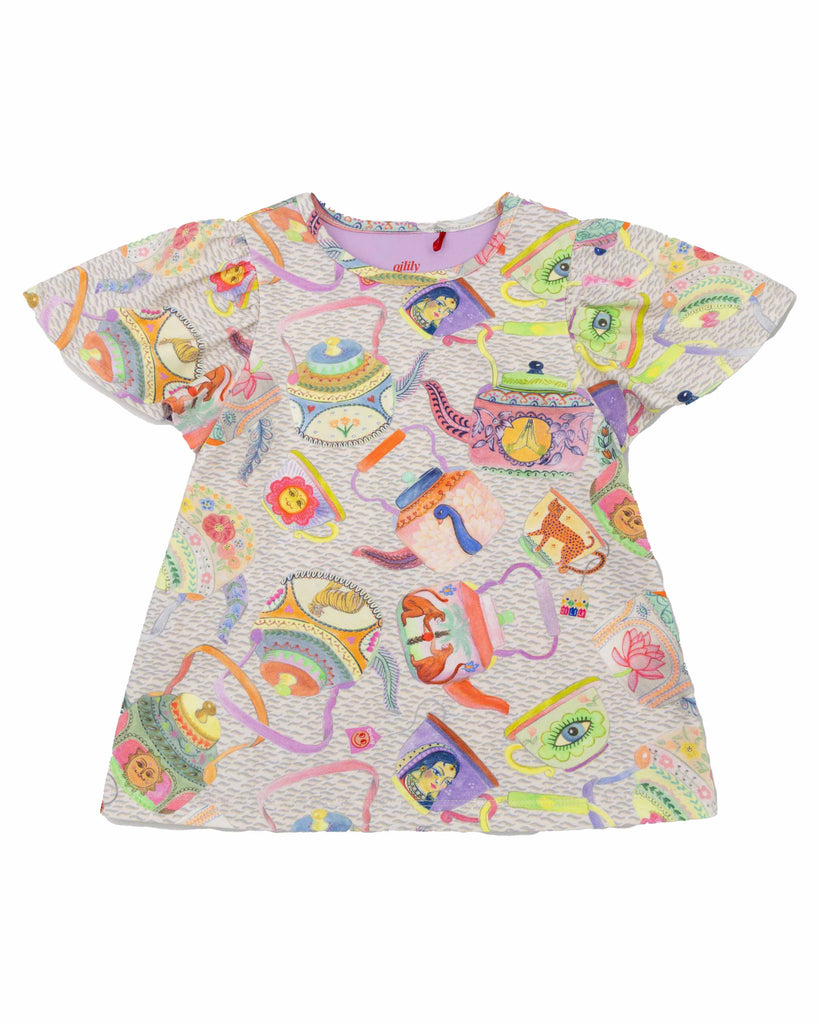 Playful T-shirt with flutter sleeves. Inspired by Indian tea culture, colourful and comfortable for everyday wear. -96% organic cotton, 4% elastane -Made in Greece