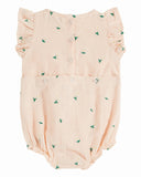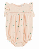 Combibloomer in pastel pink cotton gauze, embroidered with all-over daisies. Ruffles around the armholes add a delicate touch. On the practical side, openings at the back, closed by natural mother-of-pearl buttons, and three snaps at the crotch, make dressing and changing easy. The romper features elastics around the thighs to fit babies' chubby little thighs perfectly. Fully lined, the combibloomer belies the lightness of cotton gauze for optimum comfort.